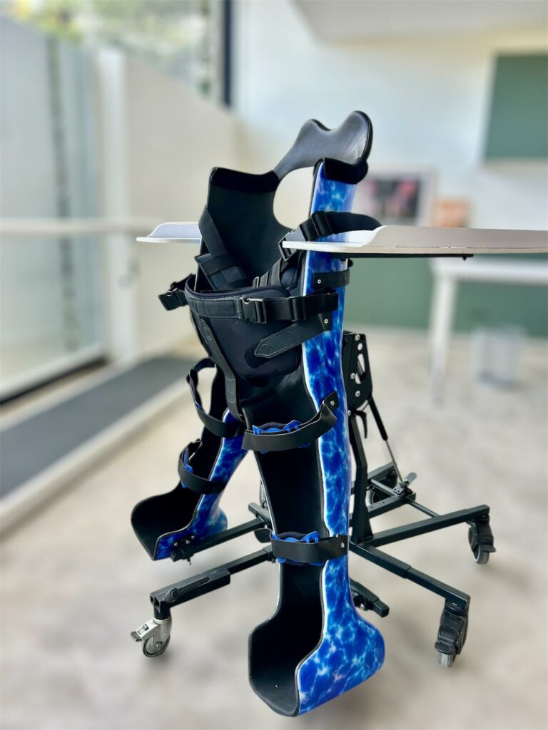 - Les verticalisateurs : dispositifs médicaux permettant d’installer et de maintenir le patient en station debout, dans une posture orthopédique correcte (tête, rachis, hanches, genoux, chevilles, pieds).